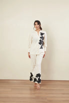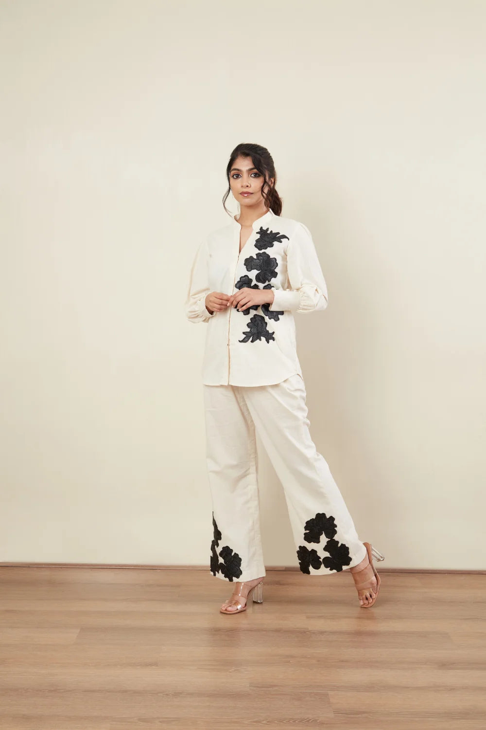 Black Floral Embriodery Lazer cut Flowers Full Sleeves Chinese Collar Shirt Trousse
